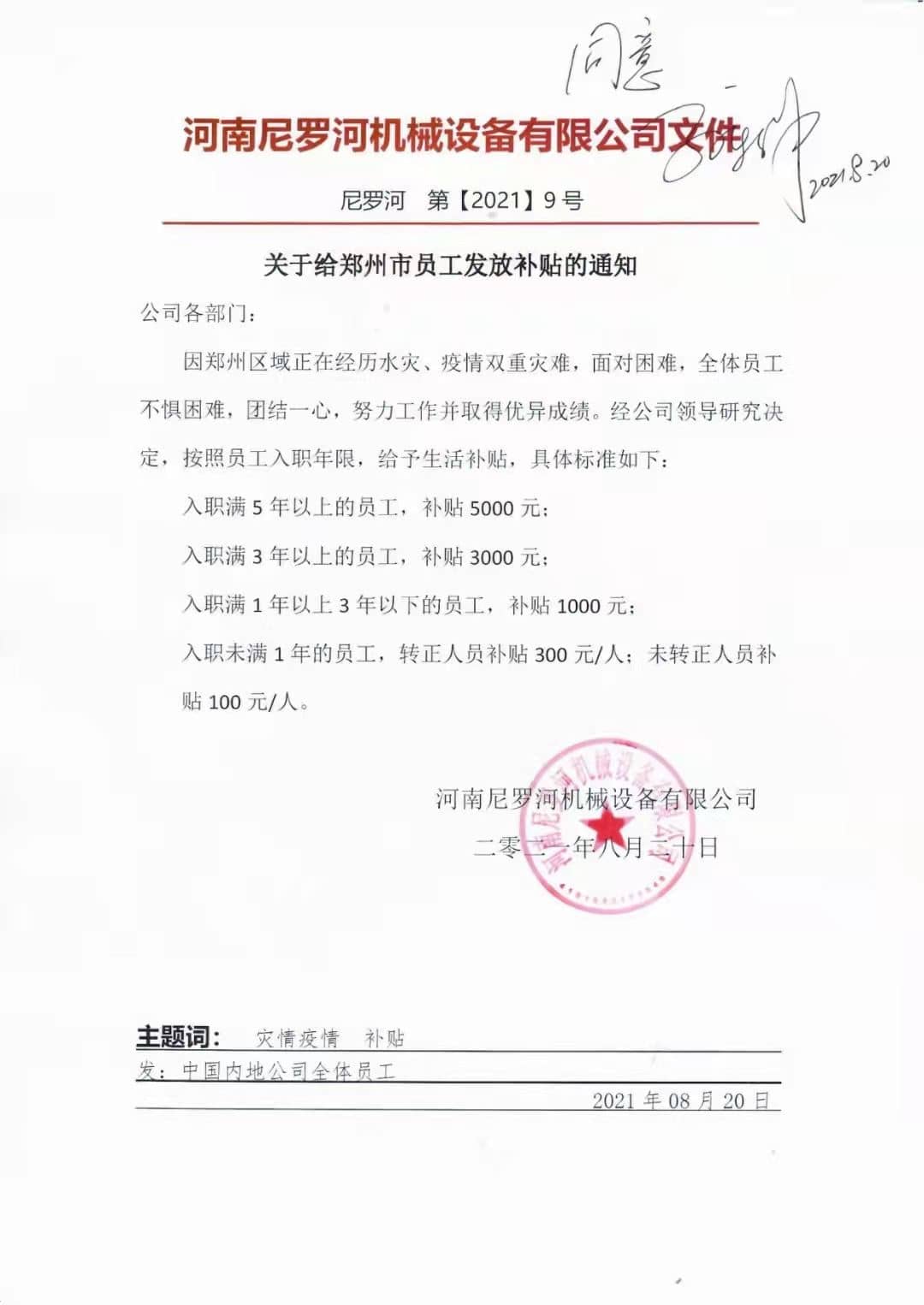 Disasters are merciless, and humans are affectionate. In the face of the epidemic and flood disasters, Nile Company issued subsidies to all employees to help overcome difficulties together.